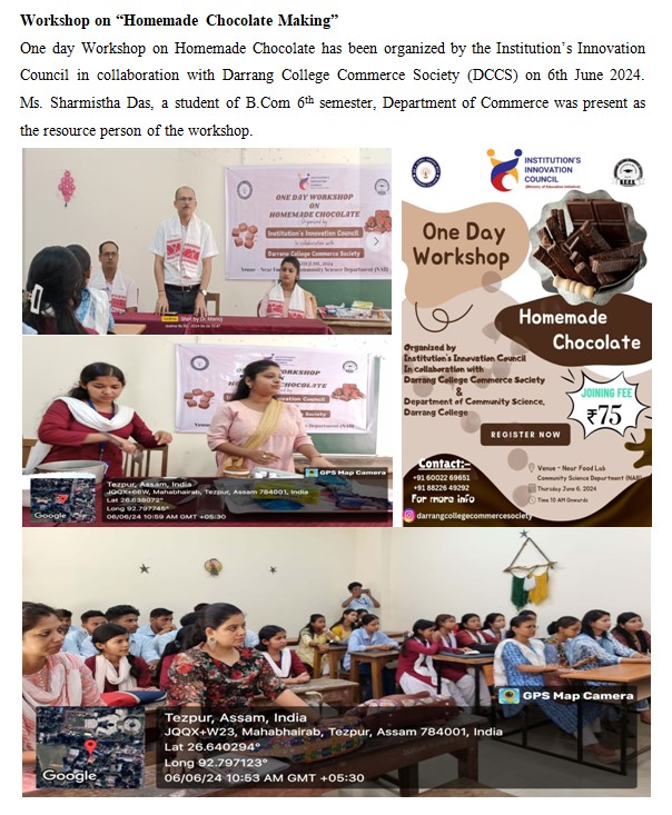 | 386 | One day Workshop on Homemade Chocolate has been organized by the IIC, Darrang College in collaboration with Darrang College Commerce Society (DCCS) on 6th June 2024. | 2024-06-24 | View File |